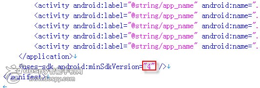 雖然minSdkVersion出現的位置不一樣,但找到後同樣果斷將其數值改為4即可: