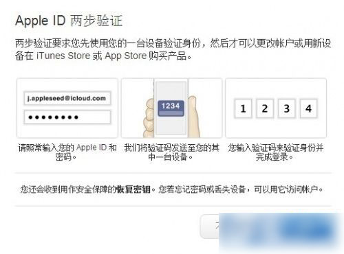 要為自己的Apple ID設置兩步式驗證,用戶需要在“我的Apple ID”中啟用驗證。啟用過程中需要用戶綁定一個受信任的手機號碼,當用戶在進行如上文所述的操作時綁定的手機號會收到四位驗證代碼,輸入後進行二次驗證。