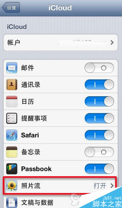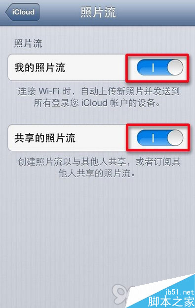 7.接著再拿起你iPhone/iPad/iPod touch,依次進入【設置】→【iCloud】→【照片流】,將【我的照片流】和【共享的照片流】功能關閉(默認為開啟狀態如下圖),這樣就徹底完全刪除照片流中的照片。