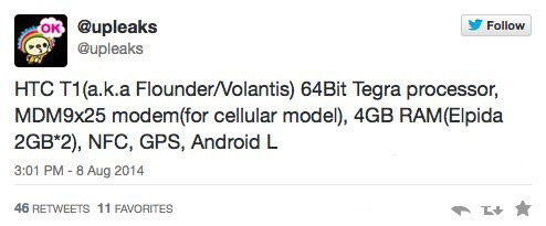 從目前掌握到的 消息 來看,這款 Android 平板配置有一塊 8.9 英寸大小 2560x1600 像素的顯示屏,使用的是 64-bit 的 Tegra 芯片,與此同時搭載了 4GB RAM,另外攝像頭配置上則是前置 160 萬像素和 800 萬主攝像頭的組合。至於系統,既然是原生的 Android L 了,那則完全拋棄掉了 HTC 的 Sense UI。