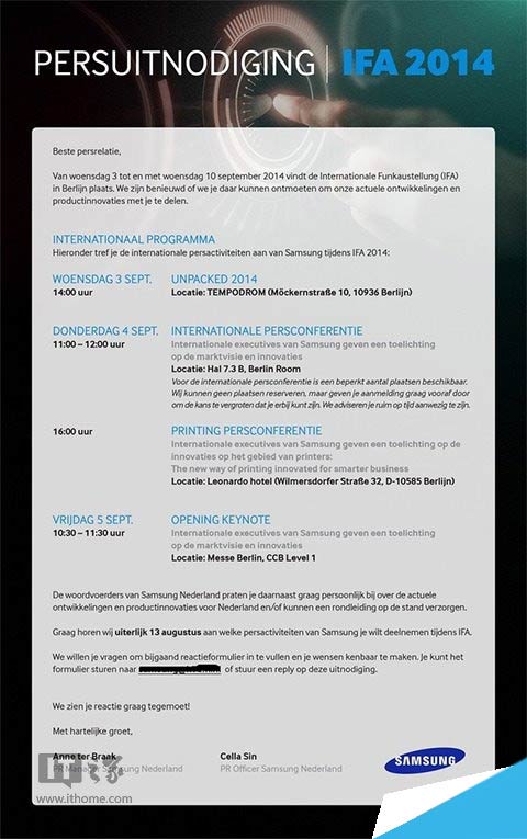 小編報道:按照計劃三星將於下個月的德國柏林國際電子消費品展覽會發布該旗艦。現在外媒已經曝光了三星9月3日新品發布會邀請函。