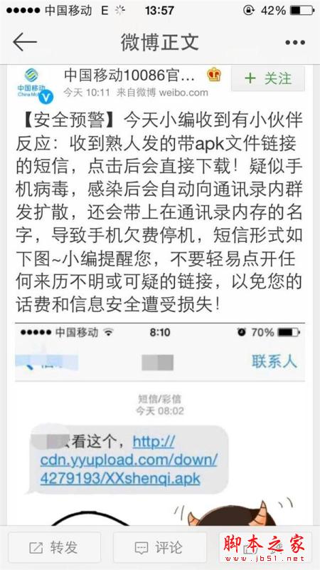 今天上午,不少手機用戶反映自己“收到一份帶apk文件鏈接的短信,點擊後會直接下載!”發短信的手機號還是自己手機通信錄中聯系人的手機號。據了解,這是一種手機病毒,點擊後可能導致手機欠費停機或被竊取通訊錄等信息,在此提醒網友注意防范。下面就詳情來看看吧