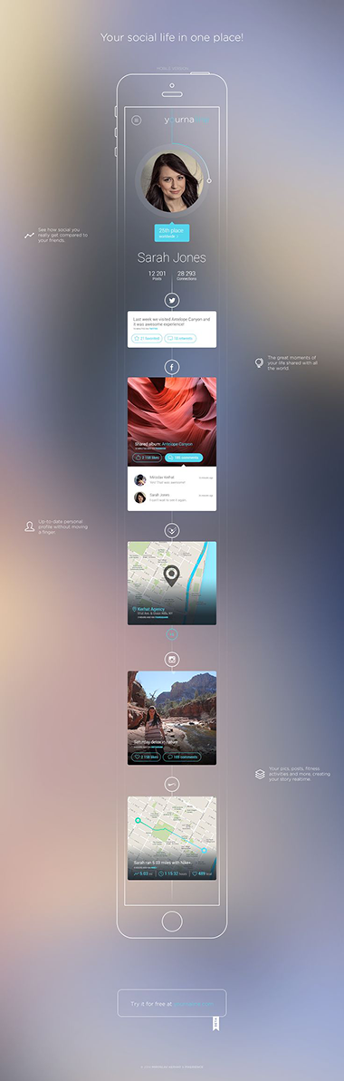 2.在《2014年全球網站設計的15個趨勢》中有所提及,超長網頁設計將會在未來受到廣泛使用。其實,國外的網站大多很擅長用這一設計手法,但類似的案例在國內並不多見,更別說在APP的引導頁中出現了,下面的案例就在這方面做出了創新。連貫的畫面為用戶帶來了連續性的思維,新穎的頁面格式也讓用戶更有新鮮感。