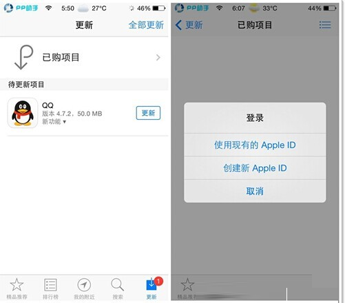 第二步:點擊選中底部導航欄最右端的「更新」選項卡,接下來然後點擊頂部的「已購項目」選項;當然,如果你還沒登錄Apple ID的話,還需要進行登錄操作。