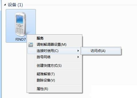 2,鼠標右鍵希望共享網絡的手機圖標,選擇“連接時使用→接入點”後便會出現“正在連接”的等待提示,等出現連接成功框後PC就可以使用手機的網絡上網了。