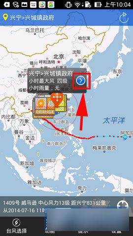 1)首先大家在手機裡先下載並打開【台風】,打開以後點擊屏幕右上方導航標志!(注;如果功能都出來了就無需點擊。)(如下圖所示)