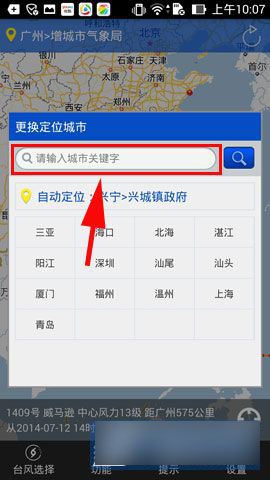 4)好的,上面是查看自己所在地的氣象信息,現在教大家如何查看其它城市信息!首先還是一樣,點擊左上方【位置圖標】,點開以後再輸入欄輸入大家想要查看的城市關鍵字!(如下圖所示)
