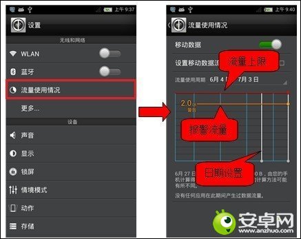 (4) 流量監控:在待機屏幕選擇“設置→流量使用情況”,可使用手機內置的流量控制功能。你可以方便地查看網絡流量、設置移動數據限制、設置警告等,從而有效管理移動數據的使用情況。你也可以再手機上安裝使用第三方的流量監控軟件,以實時監測流量的使用情況,避免不必要的超流量上網情況發生。