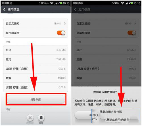 2)清除數據,會把該應用的設置及游戲進度刪除。相當於你剛安裝了這個app。