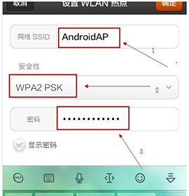 5、輸入WLAN熱點的名字,如“Andriod AP”,在“安全性”中選擇wifi信號的加密方式,如WAP2 PSK,然後輸入密碼,點擊【確定】
