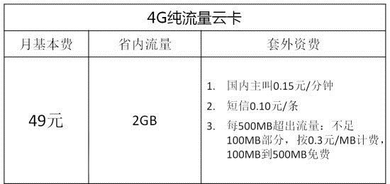 中國電信推出的4G純流量雲卡,月基本費為49元,包含省內流量2G,以下是中國電信4G純流量雲卡套餐資費詳情。