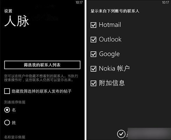 “人脈”保管著各種來源的聯系人,也許是SIM卡導入過的、或是來自電子郵箱帳戶和社交網站。隨著時間流逝,聯系人記錄增多,你會發現查找變得有些吃力,此時就需要做些清理工作。設置\應用程序\人脈\篩選我的聯系人列表,通過指定來源來縮小范圍。