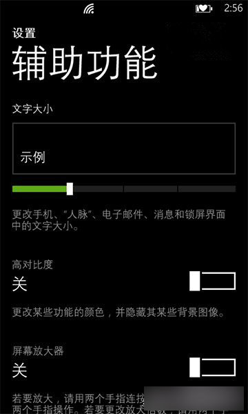 視力不好的人別總迷著眼看,何苦委屈自己。進入設置\系統\輔助功能,嘗試打開“高對比度”,增加“文字大小”,或打開“屏幕放大鏡”通過雙擊來放大,平移查看屏幕上的內容。