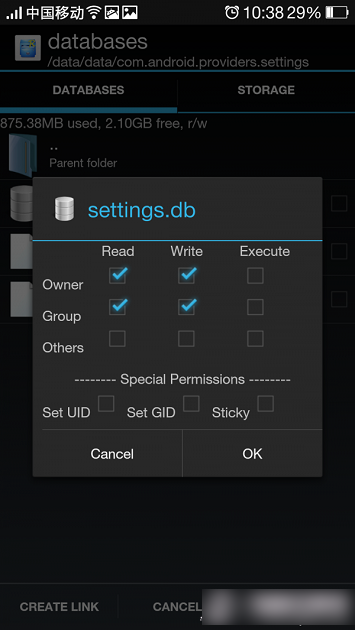 以OPPO手機為例,ROOT系統後分別在手機上安裝RE管理器(下載地址:http://t.cn/8k4PbP2)和SQlite Editor編輯器(下載地址:http://t.cn/8k4PGFO)。在RE管理器中找到並點擊data>data>com.android.providers.settings>databases目錄裡的settings.db文件(圖1),選擇用SQlite Editor編輯器打開。