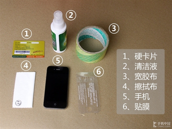 俗話說得好:“工欲善其事,必先利其器。”在開工之前,我們首先要准備好一些工具,貼膜、清潔布、清潔液是必不可少的。至於硬卡片和寬膠布的作用,稍後會跟大家介紹,在這裡先賣個關子。