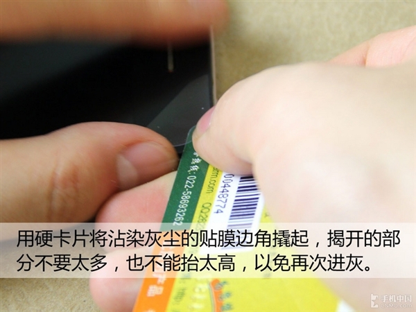 一般灰塵多會集中在邊角處,這時就可以用硬卡片將B面微微撬起,注意面積不要太大,以免造成更多的灰塵進入。