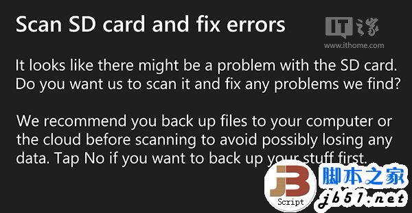 在WP8.1重新遇到SD卡錯誤後,不再提示你把卡取出交由電腦來修復,但是如果需要可以先備份。按下確認後,WP8.1系統可以自動浏覽和修復SD卡錯誤。很高興看到微軟考慮到這一點,並且更新了功能。