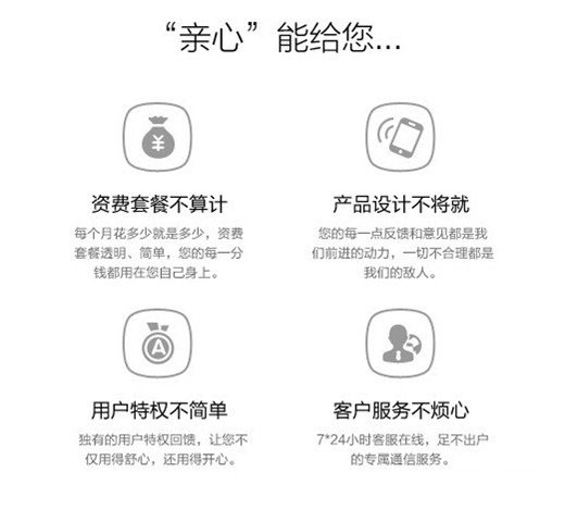 直白的說,“親心”是阿裡通信推出虛擬運營商的品牌名稱,阿裡承諾每個月話費花了多少就是多少,資費套餐透明而且簡單,保證用戶花費的每一分錢都沒有浪費掉,後期手機用戶也可以考慮阿裡的“親心”手機卡了。