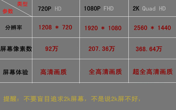 不管是720P還是1080P和2看顯示屏,其畫質顯示效果均已經達到了高清,一般說720P為高清屏,而1080P和2k為全高清屏,不難理解,1080P要比720P畫質更加出色,而2k要比1080p畫質更加高清。我們如果想想,不難發現720p手機目前屏幕大小事4寸左右,1080p手機主要屏幕大小在5英寸左右,而2k手機屏幕大小主要在5.5英寸左右,那麼這之間的聯系又是怎樣的,下面我們先來一起看看720P,1080P和2k顯示屏對比: