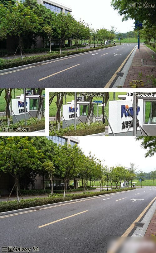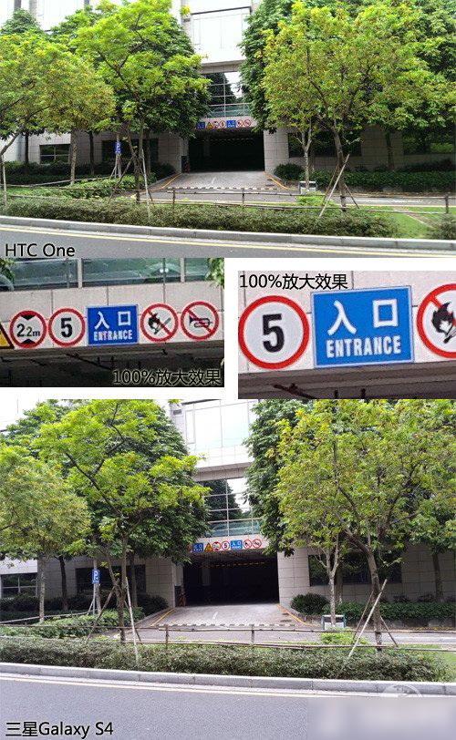 像素高在清晰度方面也會發揮積極作用,例如在光線充足的時候,用HTC One與三星GALAXY S4拍攝同一處地方時,後者放大查看就可以看到高像素的優勢,1300萬像素的GALAXY S4保留更多的細節,而400萬像素的HTC One就給人捉肩見肘的感覺。