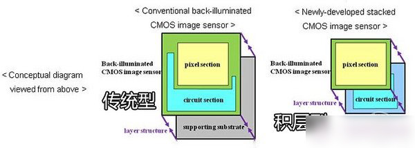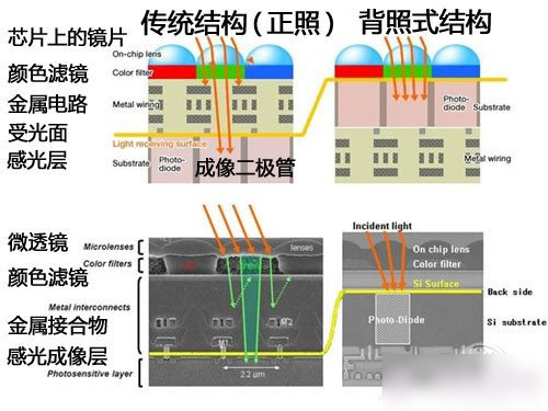 手機市場上較好的CMOS傳感器主要分為背照式(BSI)與堆棧式兩種,最先開始的為背照式傳感器,其首先被應用在索尼公司的DV產品上面,通過改良傳 感器的結構,讓光線先進入感光二極管,而傳統的CMOS傳感器的感光二極管被置於電路晶體管後方,這樣的改進大大提高了開口率,提高了傳感器的信噪比,為 小尺寸傳感器畫質帶來了飛躍式的進步。