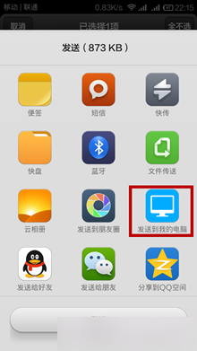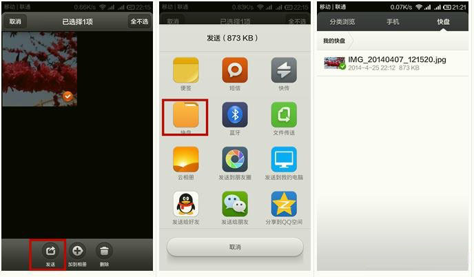 選擇你要傳輸的文件,然後選擇發送到快盤。然後去文件管理,找到了快盤的界面,就會看到剛才自己傳的照片了!