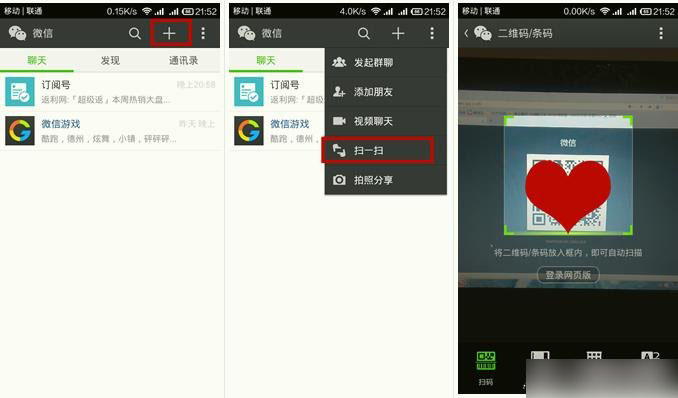 我們開啟微信,單擊右上角的+,選擇掃一掃,對著電腦掃上一掃就可以了!
