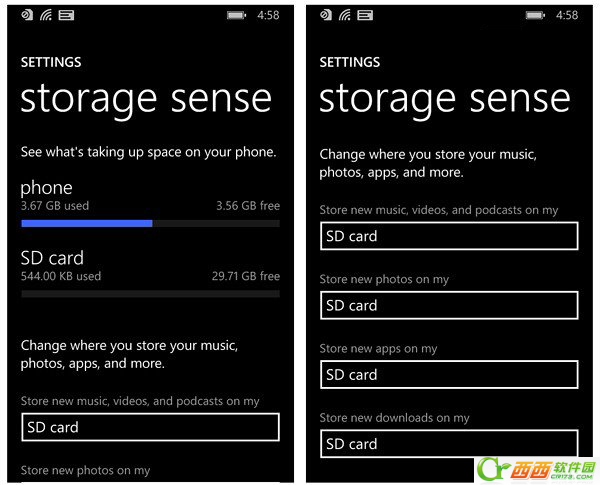 Windows Phone 8.1眾多功能之一就是允許應用和游戲安裝到SD卡上。WP8時代已經可以將手機上的圖片、音樂、視頻轉移到SD卡上。這些舉措將有助於減輕低端手機的內置存儲壓力。