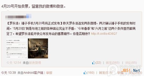 從去年錘子ROM發布至今,錘子手機已經炒了一年。羅永浩早就宣稱會在今年春季發布,但一直沒給出確切日期。直到昨天晚上,羅永浩在微博上與網友互動時候首次公布了錘子手機的發布時間為5月20日。