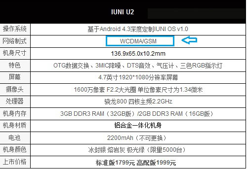 其實通過iuni u2硬件配置參數,我們就可以了解到這款手機的網絡支持情況: