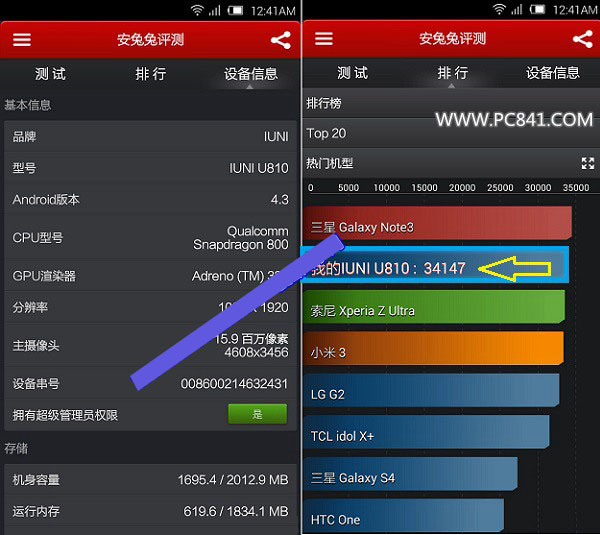IUNI U2智能手機安兔兔軟件檢測到的具體型號為“IUNI U810”,IUNI U2安兔兔跑分達到了34147分,也就是說,跑分達到了3.4萬,其跑分僅次於三星Note3旗艦手機,性能上屬於高端水平,可以說,在5英寸以下手機中,該機性能是最強的,結合出色的單手操作體驗,IUNI U2號稱單手機皇,也是名副其實。
