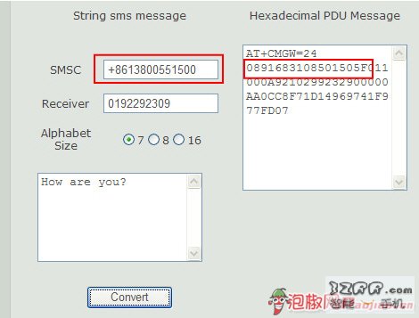 在SMSC框中輸入你的短信中心號碼,然後點下面的Convert,則PDU格式會在右邊框中生成,然後取前18位,如我的短信中心號碼的PDU格式為:0891683108501505F0,再把這18位字符輸入到手機中的SMSC框中,點後面的“更新”。