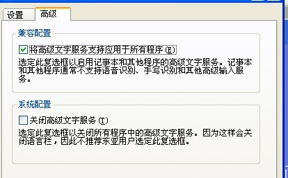 在打開的對話框中的“設置”選項卡中,單擊“高級”,取消裡面“關閉高級文字服務”前的勾: