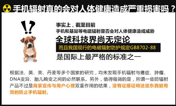 同時由於手機輻射危害人體健康的流言,一些所謂的防手機輻射的產品也受到不少用戶追捧,如防輻射貼紙、防輻射植物、防輻射衣服等等,如下圖所示: