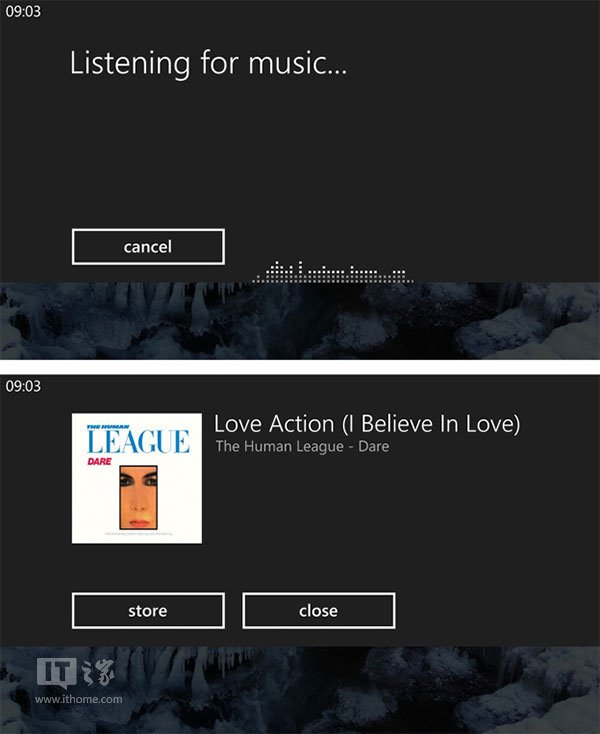 這是一項非常神奇的功能,用戶在搜索頁,打開語音聆聽功能,WP8系統將自動聆聽你現在播放的音樂,然後在WP8商店內快速為你搜索匹配的專輯,支持音樂、電台和TV頻道。
