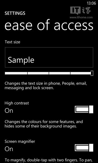 該功能來自WP8的輔助功能,支持調節文字顯示大小、高對比度、啟用屏幕放大鏡等功能。