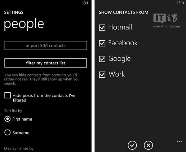 聯系人在WP8中統稱為人脈,這裡記錄著本地SIM卡、郵箱賬戶以及社交平台上的各類聯系人,因此,進入人脈功能後,選擇“篩選我的聯系人列表”,就可以快速對聯系人分類管理。
