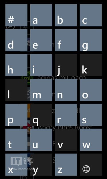 當WP8應用數目超過45個,系統會自動將應用以字母表排序,只需要知道該應用的首個英文字母或者拼音字母,就可以快速查找,定位到用戶所需的應用/。
