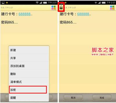 第一步:打開手機頁面上的記事本,按菜單鍵,顯示密碼設置,如下圖所示