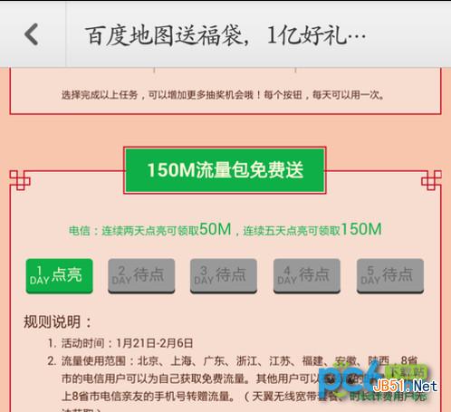 中國電信聯合百度地圖在北京、上海、廣東、江蘇、福建、安徽、陝西8省市的電信用戶都有機會獲得150MB流量,在1月21日至2月6日期間用戶只需登錄百 度地圖連續點亮2天獲得50MB流量,連續5天點亮按鈕即可有機會獲得150MB流量。需要注意的是任意一天中斷,不滿足連續登錄5天情況,都將失去領取 流量資格。