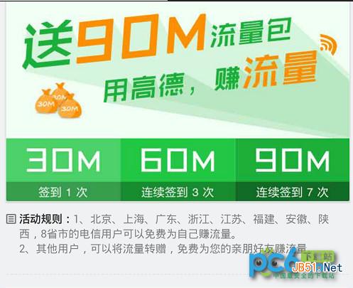 比如高德地圖推出的“用高德,送流量”活動,用戶只要下載安裝高德地圖連續簽到7次就可以獲得90M的電信流量。從1月1日到1月31日北京、上海、廣東、 浙江、江蘇、福建、安徽、陝西在內的8個省市的電信用戶就可以參與活動賺流量,當然如果你不是電信用戶還可以把流量轉贈哦。