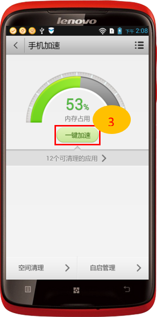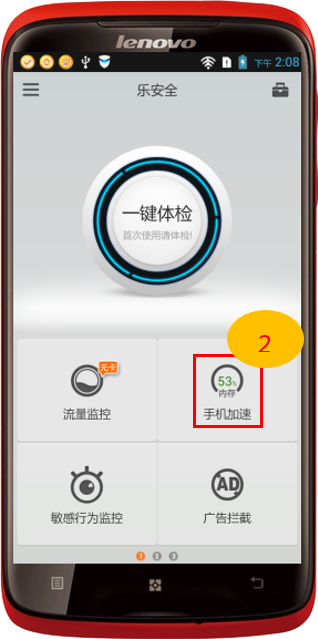 2. 啟動“樂安全”,點擊“手機加速”,點擊“一鍵加速”如圖2-2至2-3所示;