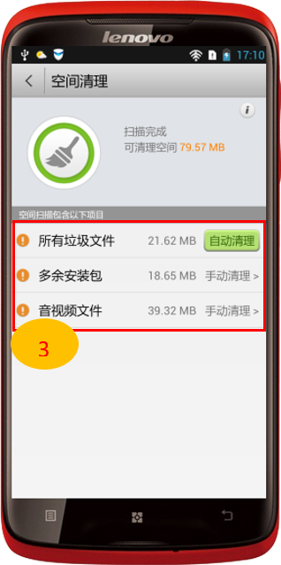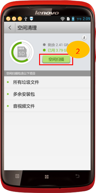 3. 通過“手機加速”左下角的“空間清理”還能清理“多余的安裝包”及“內置存儲卡”中的音視頻文件,如圖2-4至2-6所示。