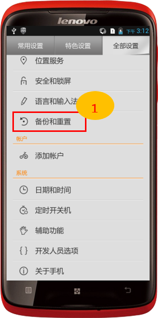1. 在“全部設置”中,找到並點擊“備份與恢復”,如圖4-1所示;