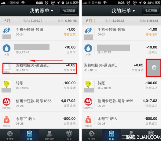2、進入賬單界面後,對其中一個賬單進行長按,然後在顯示出的界面中點擊“刪除”按鍵。這樣支付寶錢包賬單就刪除成功了。