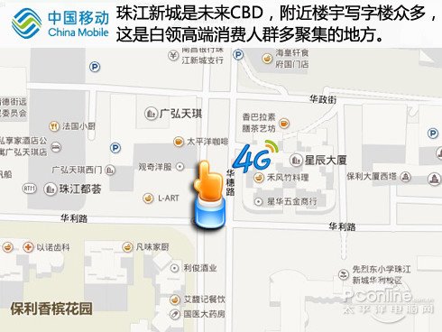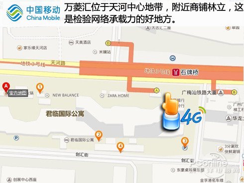 第一個地點我們選擇在天河中心的商業地區,附近商鋪林立,大型商場眾多,除了室外覆蓋之外,室內的覆蓋也是用戶體驗的重點。