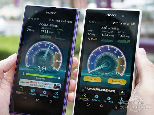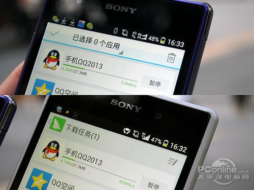 在速度測試方面,索尼Xperia Z1的對比成績基本與iPhone 5s是持平的。來到軟件下載方面的體驗,利用豌豆莢下載QQ客戶端,4G網絡下其平均下載速度達到了2.4MB/s,而3G網絡為370KB/s左右,這當中的差距還是比較巨大的。在4G版本這邊已經下載完畢的時候,3G版本那邊還沒有下載超過了一半。