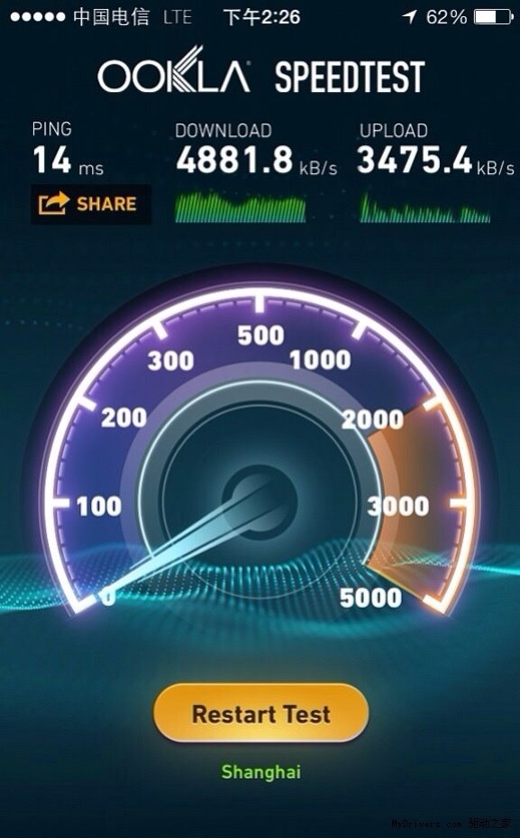 @PCINLIFE曝光的圖片顯然是來自一部iPhone,其左上角的網絡運行商顯示為中國電信LTE。具體網速方面,經過測試延遲為14ms,下載速度為4881.8KB/s(大約40MBPs),上傳速度為3475.4KB/s(大約28Mbps),這一速度相比TD-LTE網絡100Mbps的理論速度還有一定的差距,但在實際測試中能夠達到這樣的速度實屬不易了。