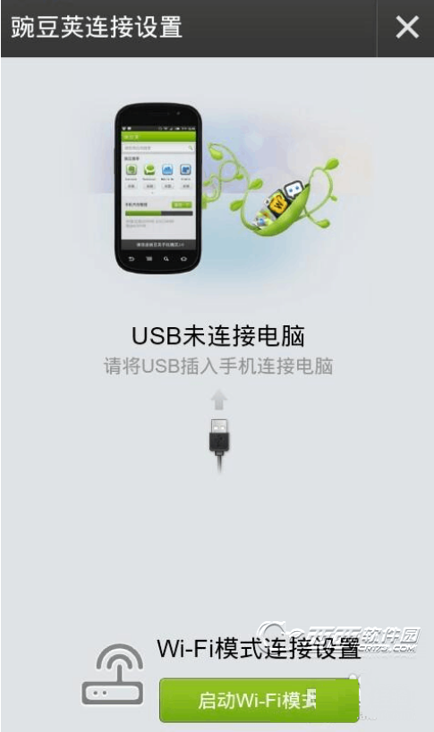 模式出現下圖,這裡就是通過無線連接的地方,如果手機通過無線 連接過那麼電腦端的豌豆莢會自動連接手機的