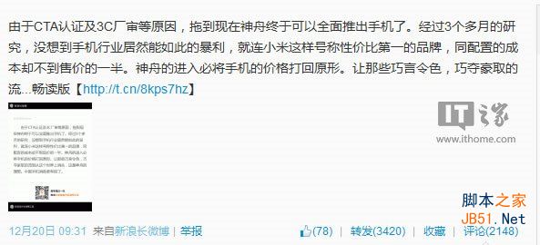 吳海軍20日在微博還稱,“經過3個多月的研究,沒想到手機行業居然能如此的暴利,就連小米這樣號稱性價比第一的品牌,同配置的成本卻不到售價的一半。神舟的進入必將手機的價格打回原形。”
